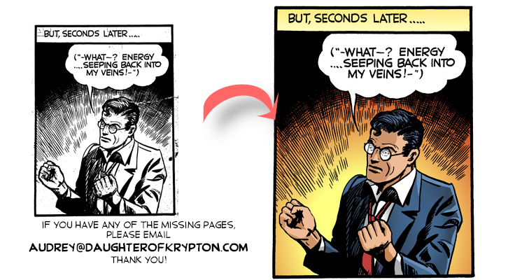 When we first started the K-Metal restoration project, the only original artwork that we had copies of was pages 5, 8, 11, 13, 15, 21 and 23. Since that time, through the help of visitors to this site, we have also obtained copies of original pages 7, 9, 12, and 20 (2005). Many have been discovered in old art catalogs. (2007: Page 1; 2008: Page 17 discovered; 2025: Pages 2, 4, and 22 discovered) If you are an owner of any of the original artwork or have copies of any of the additional original pages, please contact us. Even if we have already published our own version of the page, we will replace it with a restored version of the original page by the original artists. Out of the total 26 pages in the story, almost 11 are still lost to history: 3, 4, 6, 10, 14, 16, 18, 19, 24, 25, and 26 — waiting to be discovered. However, we have created our own versions of these missing pages in order to present The Secret of the K-Metal! as a complete, readable, full-color comic book. Some of the formerly missing pages were discovered after we had created our own versions. In a few of these cases, we present both the 1940 version along side our own, so that the reader may enjoy two different interpretations of the same page. But when we are able to, we replace our earlier-created version with the new restored, full-color version of the original Shuster Studio artwork. |